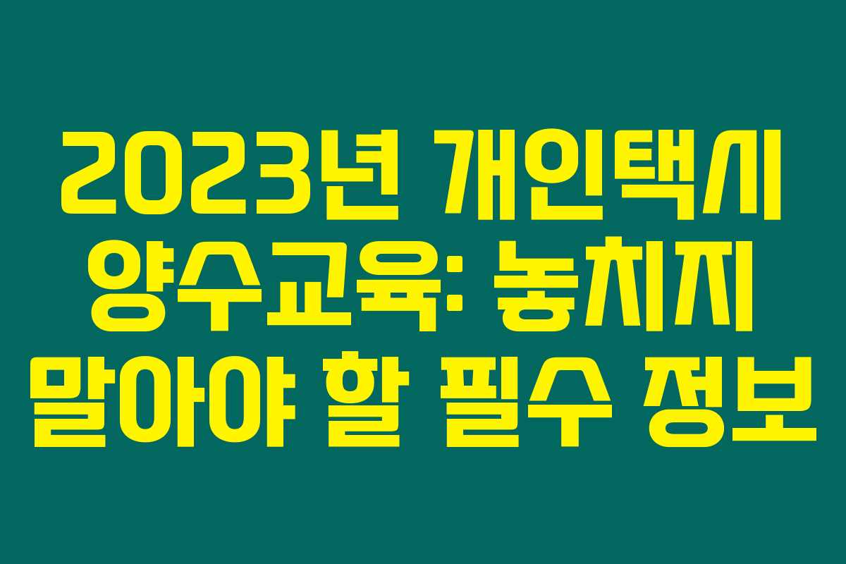 제가 직접 리서치한 바로는 2023년 개인택시 양수교육의 중요성이 해마다 더욱 부각되고 있습니다. 개인택시 면허를 취득하고자 하시는 분들이라면 세심하게 교육 일정을 체크하는 것이 필수인데요, 아래를 읽어보시면 개인택시 양수교육의 대상, 신청 자격요건, 신청 방법에 대한 유용한 정보를 확인하실 수 있습니다.