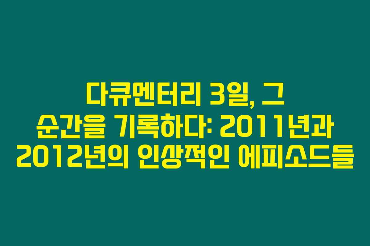 제가 직접 알아본 바로는, ‘다큐멘터리 3일’은 삶의 다양한 순간과 사람들의 이야기를 통해 우리에게 감동과 깨달음을 줍니다. 2011년과 2012년 방송된 여러 에피소드는 특색 있는 주제와 진솔한 이야기로 많은 시청자들에게 사랑받았어요. 아래를 읽어보시면, 그 에피소드들의 매력을 이해하고 더 깊게 공감할 수 있을 것입니다.