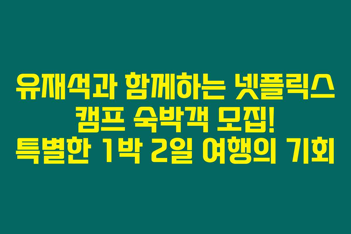 유재석과 함께하는 넷플릭스 캠프는 여러분에게 특별한 경험을 약속합니다. 1박 2일이라는 짧은 시간이지만, 그 속에서 잊지 못할 추억과 많은 웃음을 만들어 보세요. 신청 방법을 잘 확인하셔서 기회를 놓치지 마시길 바랍니다. 새로운 사람들과 함께하는 소중한 시간을 통해 더욱 풍부한 삶을 누릴 수 있을 것이라 기대해요.
