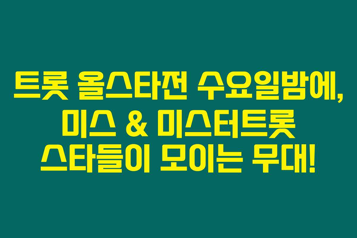 트롯 올스타전의 매력을 놓치지 마세요! 화려한 무대와 실력파 스타들의 열정이 가득한 이곳에서 주인공이 되어 갈 여러분의 모습도 상상해 보세요. 수요일 밤만 기다리면 되니까요!